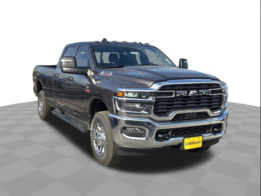 This 2025 Ram 2500 Tradesman in Granite Crystal Metallic Clearcoat includes the following features: 6.7L I6 8-Speed Automatic 4WD Quick Order Package 24A Tradesman, Tradesman Level 2 Equipment Group (115V Auxiliary Front Power Outlet, 12" Touchscreen Display, 2 Way Rear Headrest Seat, 4 Way Front Headrests, 40/20/40 Split Bench Seat, 400W Inverter, 4G LTE Wi-Fi Hot Spot, Air Conditioning ATC w/Dual Zone Control, Alexa Built-In, Anti-Spin Differential Rear Axle, Apple CarPlay, Auto-Dimming Rear-View Mirror, Black Exterior Mirrors, Bright Front Bumper, Bright Rear Bumper, Carpet Floor Covering, Center Hub, Chrome Grille Surround, Cloth 40/20/40 Bench Seat, Connected Travel & Traffic Services, Connectivity - US/Canada, Disassociated Touchscreen Display, Emergency Vehicle Alert System (EVAS), Exterior 115V AC Outlet, Exterior Mirrors Courtesy Lamps, Exterior Mirrors w/Heating Element, Exterior Mirrors w/Supplemental Signals, Front & Rear Floor Mats, Front Armrest w/Cupholders, Global Telematics Box Module (TBM), Google Android Auto, GPS Antenna Input, GPS Navigation, HD Radio, Integrated Voice Command w/Bluetooth, Manual Adjust 4-Way Driver Seat, Manual Adjust 4-Way Front Passenger Seat, Manual Folding Exterior Mirrors, Manual Telescoping Mirrors, Matte Black Mesh Grille w/Chrome, Mirror Running Lights, Mopar Black Tubular Side Steps, Off-Road Info Pages, ParkSense Front/Rear Park Assist System, Power Adjust Mirrors, Power Adjustable Convex Aux Mirrors, Power Heated Folding Telescope Mirrors, Radio: Uconnect 5 Nav w/12.0" Display, Rear Folding Seat, Rear Power Sliding Window, Remote USB Port - Charge Only, Selectable Tire Fill Alert, SiriusXM Radio Service, SiriusXM w/360L, Storage Tray, Tinted Acoustic Windshield Glass, Trailer Tow Pages, and Wheels: 18" x 8.0" Steel Chrome Clad), 4-Wheel Disc Brakes, 5th Wheel/Gooseneck Towing Prep Group, 6 Speakers, ABS brakes, Air Conditioning, AM/FM radio: SiriusXM, Apple CarPlay/Android Auto, Black Wheel Center Hub, Brake assist, Clearance Lamps, Compass, Delay-off headlights, Driver door bin, Dual front impact airbags, Dual front side impact airbags, Electronic Stability Control, Front anti-roll bar, Front Center Armrest w/Storage, Front fog lights, Front License Plate Bracket, Front reading lights, Fully automatic headlights, Heavy Duty Vinyl 40/20/40 Split Bench Seat, Illuminated entry, Low tire pressure warning, Manufacturer's Statement of Origin, Occupant sensing airbag, Outside temperature display, Overhead airbag, Overhead console, Panic alarm, ParkView Rear Back-Up Camera, Passenger door bin, Passenger vanity mirror, Power steering, Power windows, Radio data system, Radio: Uconnect 5 w/8.4" Display, Rear anti-roll bar, Rear step bumper, Rear window defroster, Remote keyless entry, Speed control, Tachometer, Tilt steering wheel, Traction control, Variably intermittent wipers, Voltmeter, and Wheels: 17" x 7.5" Black Steel Styled.