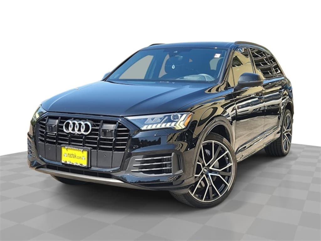 This 2023 Audi Q7 55 Prestige in Mythos Black Metallic includes the following features: 3.0L TFSI 8-Speed Automatic with Tiptronic quattro Black Optic Package, Convenience Package, Executive Package, Prestige Package (Bang & Olufsen Premium Sound System w/3D Sound, Comfort Adaptive Air Suspension, Dual-Pane Acoustic Glass for Side Windows, Head-Up Display, Illuminated Door Sills, Intersection Assist, Power Soft-Closing Doors, Remote Park Assist Plus, and Traffic Sign Recognition), Towing Package (Tow Hitch Receiver), Q7 55 Prestige quattro, 4D Sport Utility, 3.0L TFSI, 8-Speed Automatic with Tiptronic, quattro, Mythos Black Metallic, Black w/Leather Seating Surfaces or Valcona/Cricket Leather Seat Trim, Wheels: 22" 5-V-Spoke Star Design, 10 Speakers, 3.204 Axle Ratio, 3rd row seats: bench, 4-Wheel Disc Brakes, ABS brakes, Air Conditioning, Alloy wheels, AM/FM radio: SiriusXM w/ 360L, Auto High-beam Headlights, Auto-dimming door mirrors, Auto-dimming Rear-View mirror, Automatic temperature control, Brake assist, Bumpers: body-color, Compass, Delay-off headlights, Driver door bin, Driver vanity mirror, Dual front impact airbags, Dual front side impact airbags, Electronic Stability Control, Emergency communication system: Audi connect CARE, Exterior Parking Camera Rear, Four wheel independent suspension, Front anti-roll bar, Front Bucket Seats, Front Center Armrest, Front dual zone A/C, Front fog lights, Front reading lights, Fully automatic headlights, Garage door transmitter: HomeLink, Genuine wood door panel insert, Heated door mirrors, Heated Front Bucket Seats, Heated front seats, Illuminated entry, Leather Seating Surfaces, Leather Shift Knob, Leather steering wheel, Low tire pressure warning, Memory seat, Navigation system: Audi MMI Navigation plus with Touch Response, Occupant sensing airbag, Outside temperature display, Overhead airbag, Overhead console, Panic alarm, Passenger door bin, Passenger vanity mirror, Power door mirrors, Power driver seat, Power Liftgate, Power moonroof: Panoramic, Power passenger seat, Power steering, Power windows, Radio data system, Radio: Audi Sound System, Rain sensing wipers, Rear air conditioning, Rear anti-roll bar, Rear fog lights, Rear reading lights, Rear seat center armrest, Rear side impact airbag, Rear window defroster, Rear window wiper, Reclining 3rd row seat, Remote keyless entry, Roof rack: rails only, Security system, Speed control, Speed-sensing steering, Split folding rear seat, Spoiler, Steering wheel memory, Steering wheel mounted audio controls, Tachometer, Telescoping steering wheel, Tilt steering wheel, Traction control, Trip computer, Turn signal indicator mirrors, and Variably intermittent wipers.