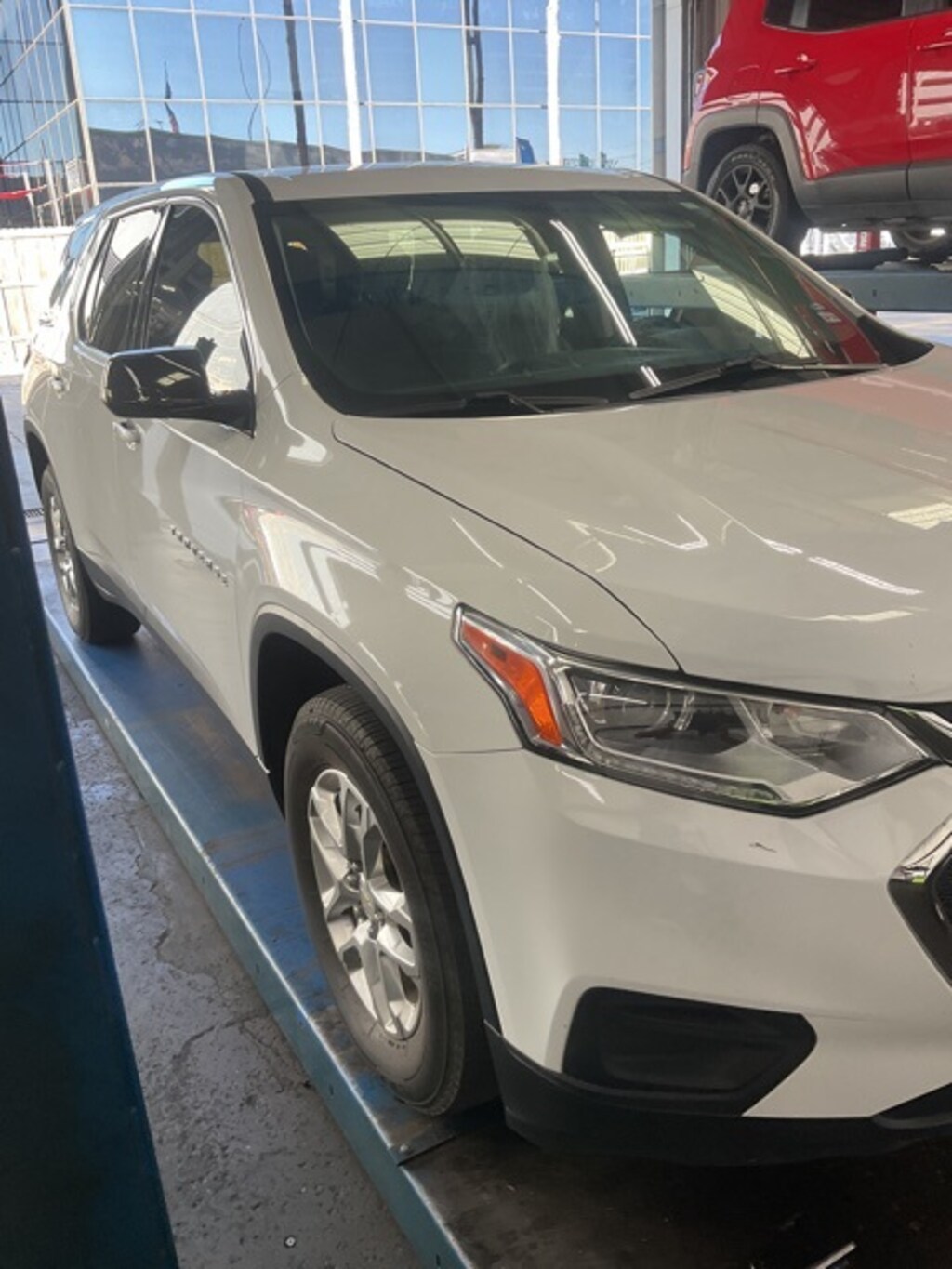 This 2020 Chevrolet Traverse LS in Summit White includes the following features: 3.6L V6 SIDI VVT 9-Speed Automatic FWD Front License Plate Bracket Mounting Package, Preferred Equipment Group 1LS, Traverse LS, 4D Sport Utility, 3.6L V6 SIDI VVT, 9-Speed Automatic, FWD, Summit White, Jet Black Cloth, 3.49 Axle Ratio, 3rd row seats: split-bench, 4-Wheel Disc Brakes, 6 Speakers, 8-Passenger Seating (2-3-3 Seating Configuration), ABS brakes, Air Conditioning, Alloy wheels, AM/FM radio, Apple CarPlay/Android Auto, Automatic temperature control, Brake assist, Bumpers: body-color, Compass, Delay-off headlights, Driver door bin, Driver vanity mirror, Dual front impact airbags, Dual front side impact airbags, Electronic Stability Control, Emergency communication system: OnStar and Chevrolet connected services capable, Four wheel independent suspension, Front anti-roll bar, Front Bucket Seats, Front Center Armrest, Front dual zone A/C, Front reading lights, Fully automatic headlights, Heated door mirrors, High-Intensity Discharge Headlights, Illuminated entry, Low tire pressure warning, Occupant sensing airbag, Outside temperature display, Overhead airbag, Overhead console, Panic alarm, Passenger door bin, Passenger vanity mirror, Power door mirrors, Power steering, Power windows, Premium Cloth Seat Trim, Radio data system, Radio: Chevrolet Infotainment System AM/FM Stereo, Rear air conditioning, Rear anti-roll bar, Rear reading lights, Rear window defroster, Rear window wiper, Remote keyless entry, Security system, Speed control, Speed-sensing steering, Split folding rear seat, Spoiler, Steering wheel mounted audio controls, Tachometer, Telescoping steering wheel, Tilt steering wheel, Traction control, Trip computer, Variably intermittent wipers, Voltmeter, and Wheels: 18" Bright Silver Painted Aluminum. Recent Arrival! 18/27 City/Highway MPG