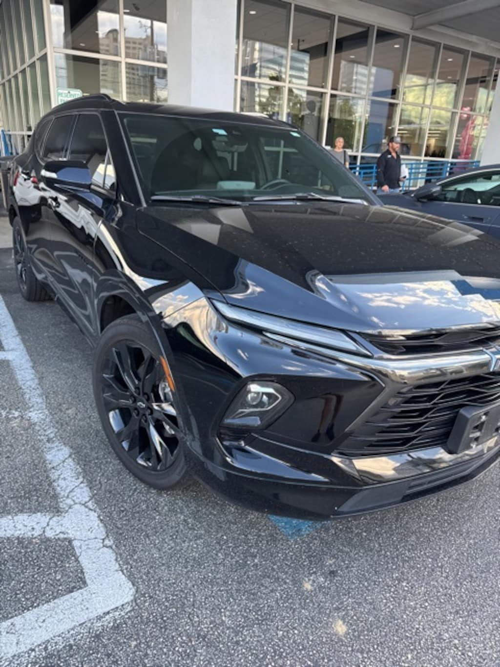 This 2023 Chevrolet Blazer RS in Black includes the following features: 3.6L V6 SIDI 9-Speed Automatic with Overdrive FWD Driver Confidence II Package (Adaptive Cruise Control, Enhanced Automatic Emergency Braking, HD Surround Vision, Rear Camera Mirror, Rear Camera Mirror Washer, and Safety Alert Seat), Enhanced Convenience Package (Heated Rear Outboard Seating Positions, Memory Settings For Driver Seat & Exterior Mirrors, Power Tilt & Telescoping Steering Column, and Ventilated Driver & Front Passenger Seats), Floor Liner Package (LPO) (1st & 2nd Row All-Weather Floor Liners (LPO) and Integrated Cargo Liner (LPO)), Preferred Equipment Group 1RS (Heated Steering Wheel and Rear Park Assist w/Audible Warning), Blazer RS, 4D Sport Utility, Black, Jet Black Leather, 3.49 Final Drive Axle Ratio, 4-Wheel Disc Brakes, 6-Way Power Front Passenger Seat Adjuster, 8 Speakers, 8-Way Power Driver Seat Adjuster, ABS brakes, Air Conditioning, Alloy wheels, AM/FM radio: SiriusXM with 360L, Apple CarPlay/Android Auto, Auto High-beam Headlights, Auto-dimming door mirrors, Auto-dimming Rear-View mirror, Automatic temperature control, Black Illuminated Front Bowtie Emblem (LPO), Black Lug Nut & Wheel Lock Kit (LPO), Bose Premium 8-Speaker Audio System Feature, Brake assist, Bumpers: body-color, Child-Seat-Sensing Airbag, Compass, Delay-off headlights, Driver door bin, Driver vanity mirror, Dual front impact airbags, Dual front side impact airbags, Electronic Stability Control, Emergency communication system: OnStar and Chevrolet connected services capable, Four wheel independent suspension, Front anti-roll bar, Front Bucket Seats, Front Center Armrest, Front dual zone A/C, Front reading lights, Fully automatic headlights, Garage door transmitter, Heated door mirrors, Heated Driver & Front Passenger Seats, Heated front seats, Heated steering wheel, Illuminated entry, Knee airbag, Leather Shift Knob, Low tire pressure warning, Navigation System, Occupant sensing airbag, Outside temperature display, Overhead airbag, Overhead console, Panic alarm, Passenger door bin, Passenger vanity mirror, Perforated Leather-Appointed Seat Trim, Power door mirrors, Power Driver Lumbar Control, Power driver seat, Power Liftgate, Power Panoramic Tilt-Sliding Sunroof, Power passenger seat, Power steering, Power windows, Premium audio system: Chevrolet Infotainment 3 Premium, Radio data system, Radio: Chevrolet Infotainment 3 Premium System, Rear anti-roll bar, Rear reading lights, Rear seat center armrest, Rear window defroster, Rear window wiper, Remote keyless entry, Ride & Handling Suspension, Security system, SiriusXM w/360L, Speed control, Speed-sensing steering, Split folding rear seat, Spoiler, Steering wheel mounted audio controls, Tachometer, Telescoping steering wheel, Tilt steering wheel, Traction control, Trip computer, Turn signal indicator mirrors, Variably intermittent wipers, Voltmeter, Wheels: 20" Technical Gray Aluminum, and Wheels: 21" High Gloss Black w/Machined Face. Recent Arrival! 19/27 City/Highway MPG