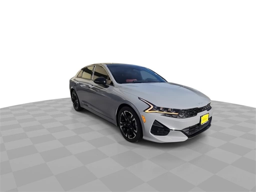 This 2022 Kia K5 GT-Line in Wolf Gray includes the following features: I4 8-Speed Automatic FWD K5 GT-Line, 4D Sedan, I4, 8-Speed Automatic, FWD, Wolf Gray, Black Leatherette, 4-Wheel Disc Brakes, 6 Speakers, ABS brakes, Air Conditioning, Alloy wheels, AM/FM radio: SiriusXM, Apple CarPlay & Android Auto, Auto High-beam Headlights, Automatic temperature control, Brake assist, Bumpers: body-color, Cloth/Leatherette Seat Trim, Delay-off headlights, Driver door bin, Driver vanity mirror, Dual front impact airbags, Dual front side impact airbags, Electronic Stability Control, Four wheel independent suspension, Front anti-roll bar, Front Center Armrest, Front dual zone A/C, Front fog lights, Front reading lights, Fully automatic headlights, Heated door mirrors, Illuminated entry, Knee airbag, Low tire pressure warning, Navigation System, Occupant sensing airbag, Outside temperature display, Overhead airbag, Overhead console, Panic alarm, Passenger door bin, Passenger vanity mirror, Power door mirrors, Power driver seat, Power steering, Power windows, Radio data system, Radio: AM/FM/MP3 Audio System, Rear anti-roll bar, Rear seat center armrest, Rear side impact airbag, Rear window defroster, Remote keyless entry, Security system, Speed control, Speed-sensing steering, Split folding rear seat, Spoiler, Sport steering wheel, Steering wheel mounted audio controls, Tachometer, Telescoping steering wheel, Tilt steering wheel, Traction control, Trip computer, Turn signal indicator mirrors, Variably intermittent wipers, and Wheels: 7.5J x 18" Gloss Black Machined Finish Alloy. Recent Arrival! 27/37 City/Highway MPG