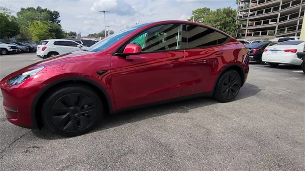 This 2025 Tesla Model Y Long Range in Ultra Red includes the following features: Electric Motor 1-Speed Automatic AWD Model Y Long Range, 4D Sport Utility, Electric Motor, AWD, Ultra Red, Black Leather, 14 Speakers, 4-Wheel Disc Brakes, 5 Seat Interior, ABS brakes, Air Conditioning, Alloy wheels, Audio memory, Auto High-beam Headlights, Auto tilt-away steering wheel, Auto-dimming door mirrors, Auto-dimming Rear-View mirror, Automatic temperature control, Brake assist, Bumpers: body-color, Compass, Delay-off headlights, Driver door bin, Driver vanity mirror, Dual front impact airbags, Dual front side impact airbags, Electronic Stability Control, Emergency communication system, Exterior Parking Camera Rear, Four wheel independent suspension, Front anti-roll bar, Front Bucket Seats, Front Center Armrest, Front dual zone A/C, Front fog lights, Front reading lights, Fully automatic headlights, Genuine wood dashboard insert, Heated door mirrors, Heated front seats, Heated rear seats, Heated steering wheel, HVAC memory, Illuminated entry, Knee airbag, Lane Departure Warning System, Low tire pressure warning, Memory seat, Navigation System, Occupant sensing airbag, Outside temperature display, Overhead airbag, Passenger door bin, Passenger vanity mirror, Power door mirrors, Power driver seat, Power Liftgate, Power passenger seat, Power steering, Power windows, Radio data system, Radio: Premium Audio System w/13 Speakers, Rain sensing wipers, Rear air conditioning, Rear reading lights, Rear seat center armrest, Rear window defroster, Security system, Speed control, Speed-sensing steering, Split folding rear seat, Steering wheel memory, Steering wheel mounted A/C controls, Steering wheel mounted audio controls, Telescoping steering wheel, Tilt steering wheel, Traction control, Trip computer, Variably intermittent wipers, Vegan Leather Seat Trim, and Wheels: 19" x 9.5" Gemini Dark. Recent Arrival! 123/111 City/Highway MPG