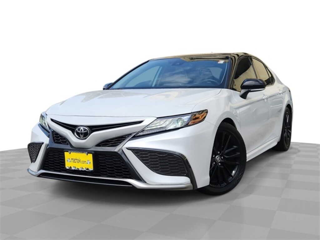 This 2021 Toyota Camry XSE in White includes the following features: 2.5L I4 DOHC 16V 8-Speed Automatic AWD Camry XSE, 4D Sedan, 2.5L I4 DOHC 16V, 8-Speed Automatic, AWD, White, Black Leather, 4-Wheel Disc Brakes, 6 Speakers, ABS brakes, Air Conditioning, Alloy wheels, AM/FM radio: SiriusXM, Apple CarPlay/Android Auto, Auto High-beam Headlights, Auto-dimming Rear-View mirror, Automatic temperature control, Brake assist, Bumpers: body-color, Delay-off headlights, Driver door bin, Driver vanity mirror, Dual front impact airbags, Dual front side impact airbags, Electronic Stability Control, Emergency communication system: Safety Connect with 1-year trial, Exterior Parking Camera Rear, Four wheel independent suspension, Front anti-roll bar, Front Bucket Seats, Front Center Armrest, Front dual zone A/C, Front reading lights, Fully automatic headlights, Garage door transmitter: HomeLink, Heated door mirrors, Heated front seats, Illuminated entry, Knee airbag, Low tire pressure warning, Multi-Stage Heated Front Bucket Seats, Occupant sensing airbag, Outside temperature display, Overhead airbag, Overhead console, Panic alarm, Passenger door bin, Passenger vanity mirror, Perforated Leather Seat Trim, Power door mirrors, Power driver seat, Power passenger seat, Power steering, Power windows, Radio data system, Radio: AM/FM/HD Audio Plus, Rear anti-roll bar, Rear reading lights, Rear seat center armrest, Rear side impact airbag, Rear window defroster, Remote keyless entry, Security system, Speed control, Speed-sensing steering, Split folding rear seat, Spoiler, Steering wheel mounted audio controls, Tachometer, Telescoping steering wheel, Tilt steering wheel, Traction control, Trip computer, Turn signal indicator mirrors, Variably intermittent wipers, and Wheels: 8.0J x 19" Black Machined-Finish Alloy. Recent Arrival! 25/34 City/Highway MPG
